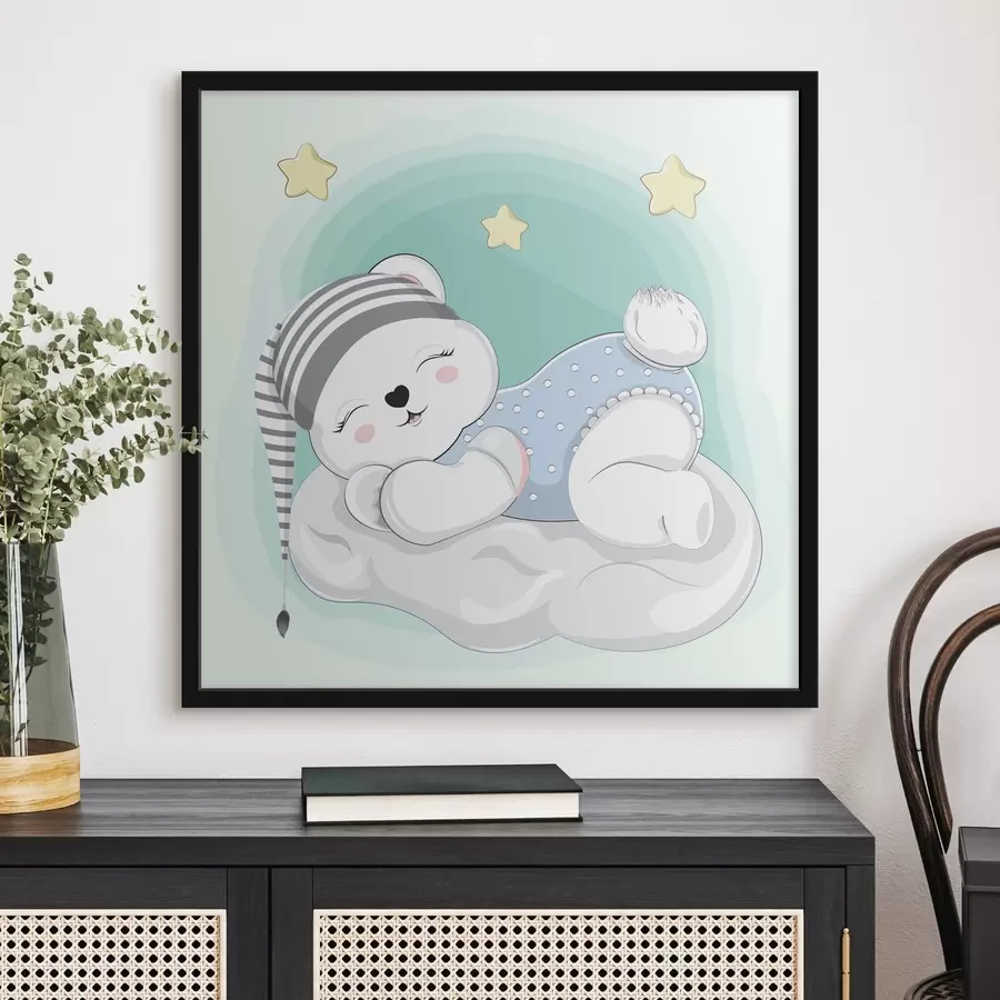 Žavus lokys, svajojantis ant debesies