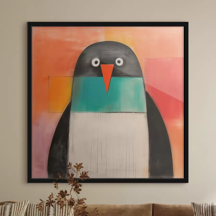 Pingvinas raudonai oranžiniame fone plokščias piešinys
