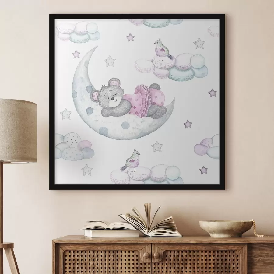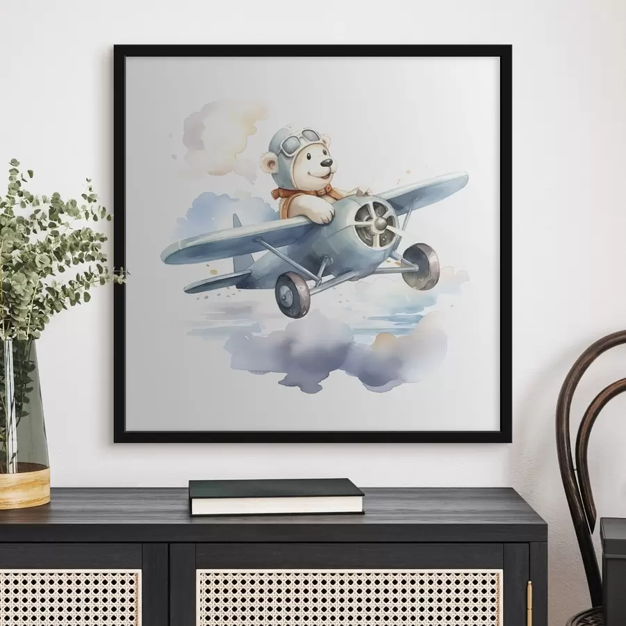 Baltas meškiukas su akiniais skrenda lėktuvu akvarelinė iliustracija vaikams