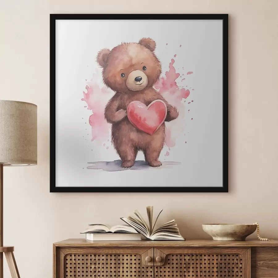 Rudasis lokys sėdi po rožiniu skėčiu ir rankose laiko rožę, akvarelė vaikams