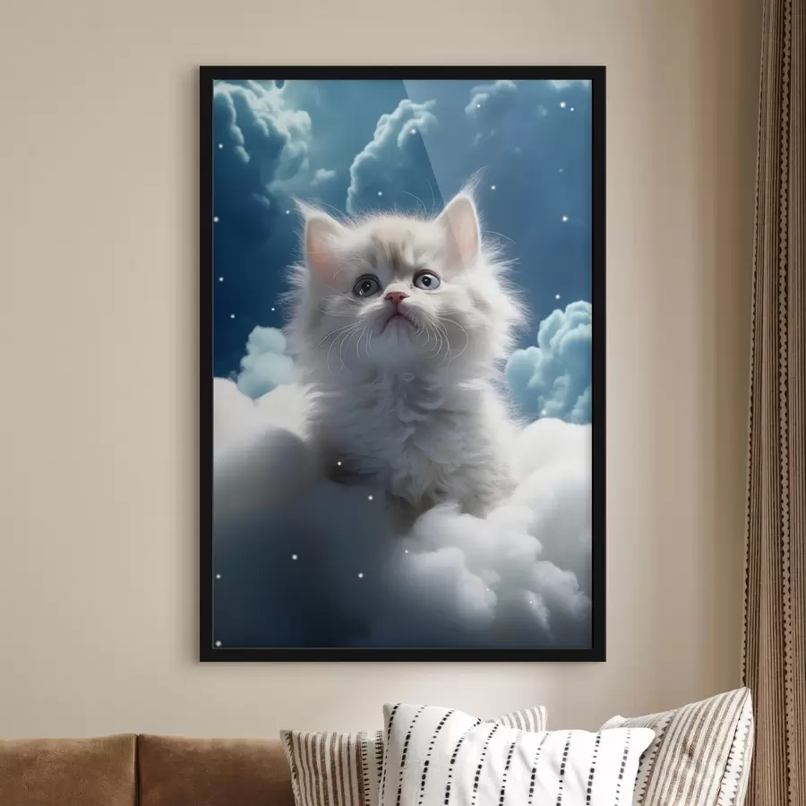 Baltas pūkuotas kačiukas danguje sėdi ant debesies