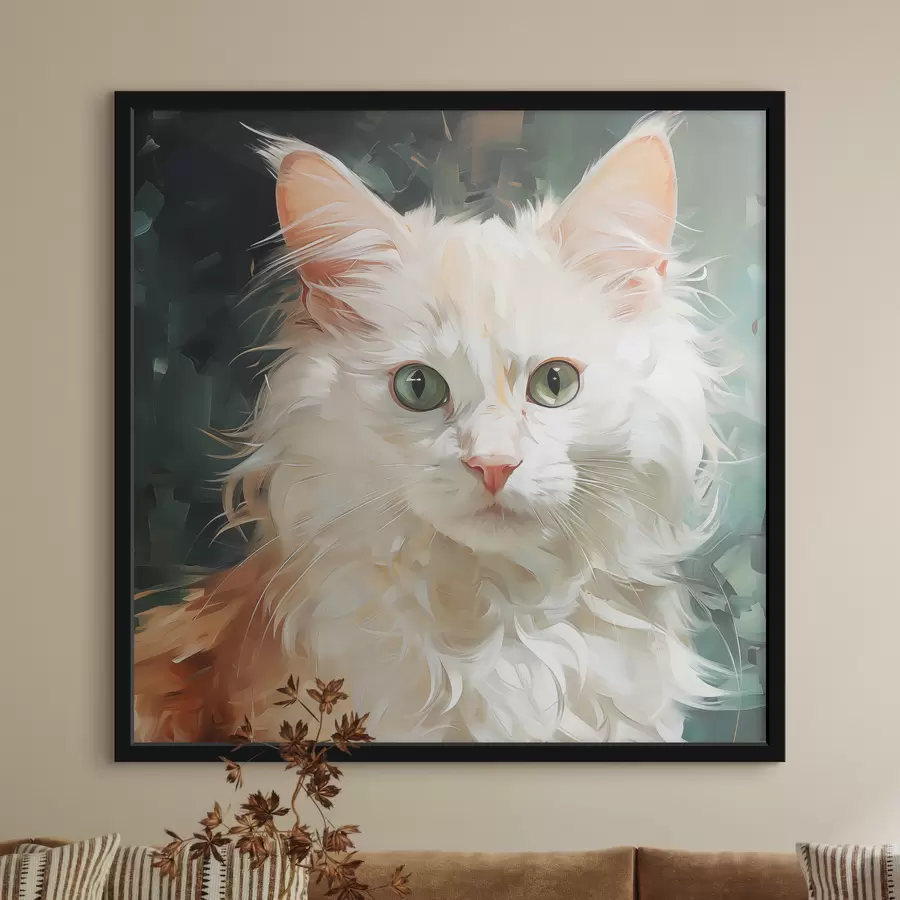 Balta pūkuota katė žaliomis akimis žaliame portreto fone