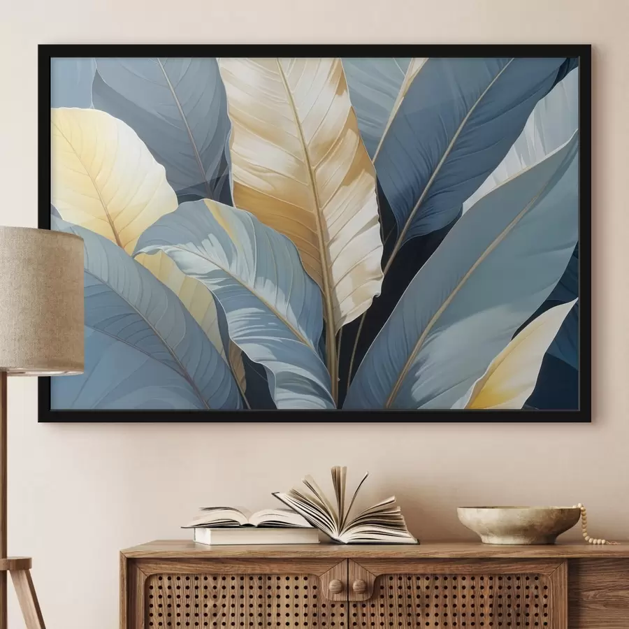 Atogrąžų lapai su mėlynais ir geltonais atspalviais, dideli palmių ar bananų lapai su sodriu, natūraliu fonu