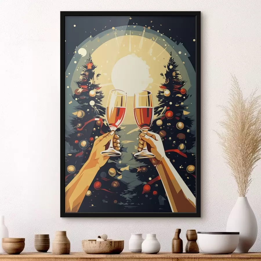 Taurės su šampanu, Kalėdos, Naujieji metai, abstrakcija, pop menas, pušys