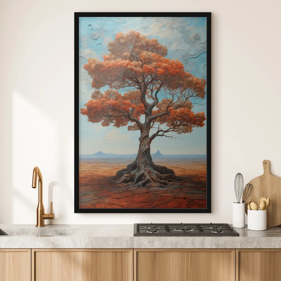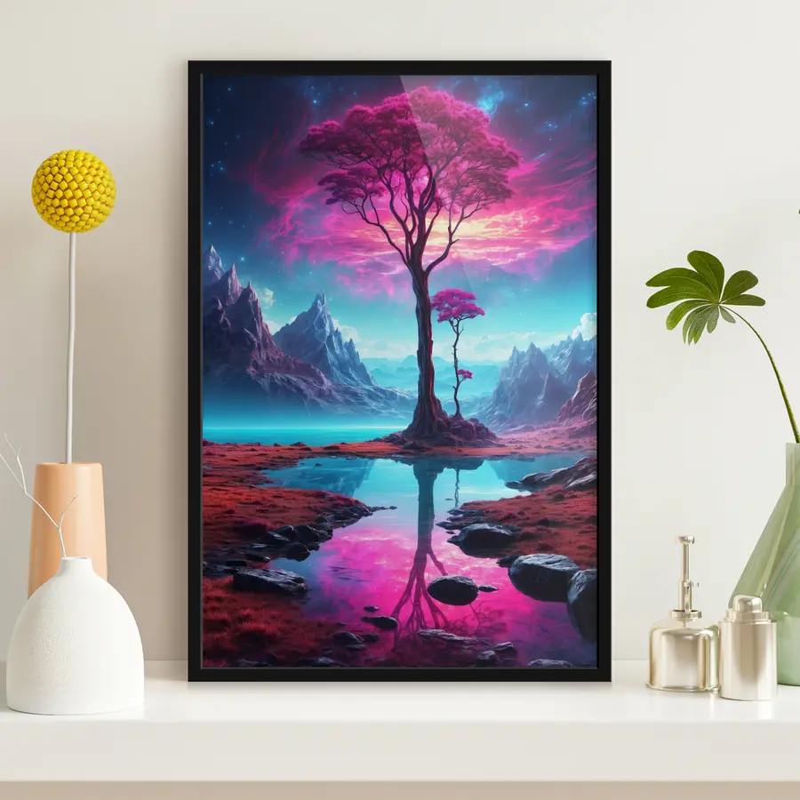 Samurajus su kardu violetiniu apsiaustu eina link kalnų abstrakčiojo meno tapybos