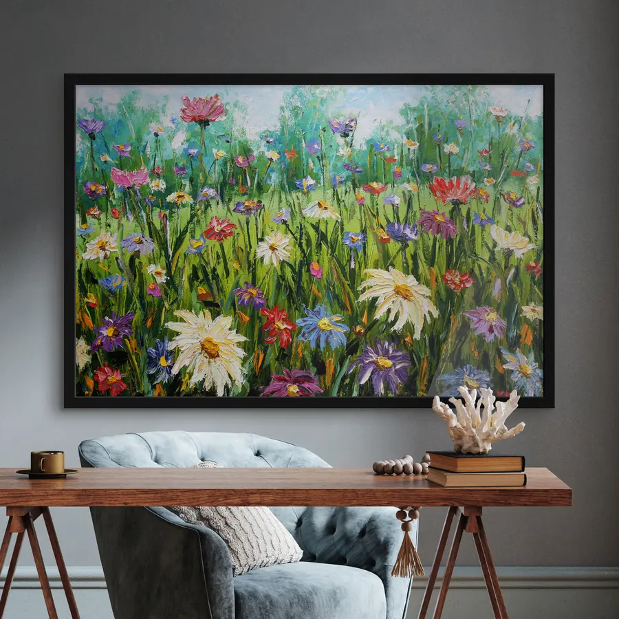 Baltos gėlės pievoje aliejiniu stiliumi
