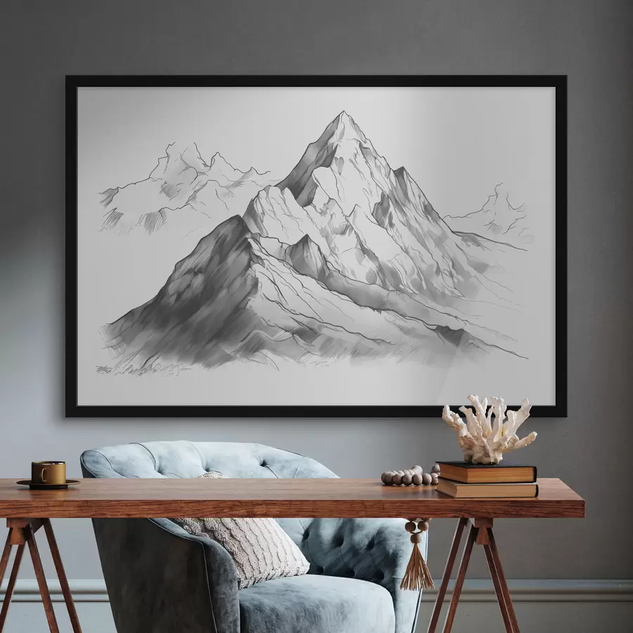 Juodai baltas minimalistinio stiliaus kalno paveikslas