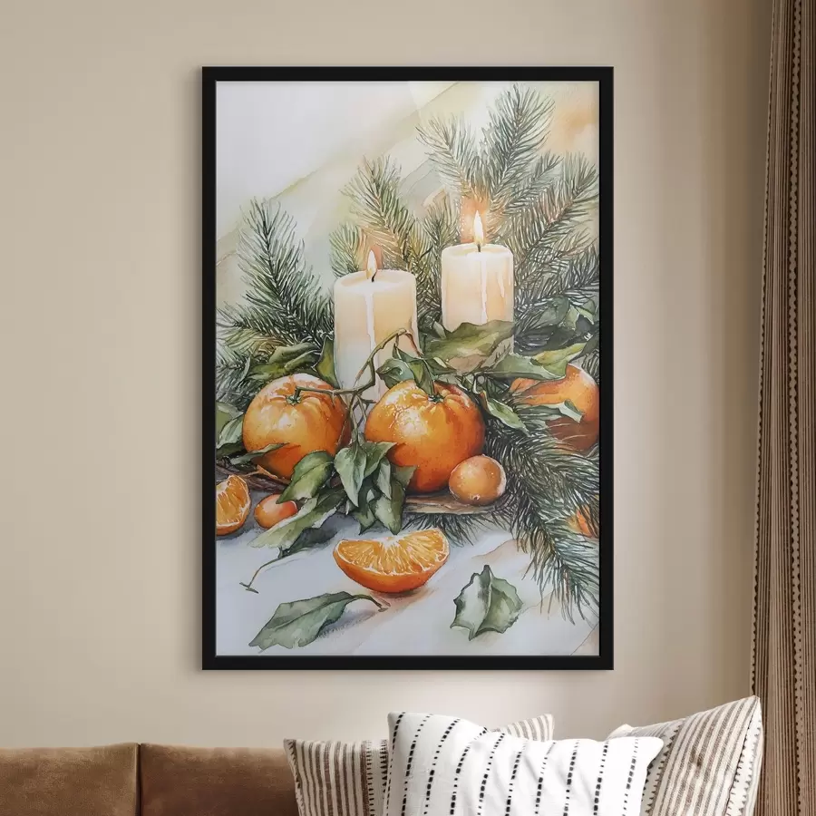 Pušies šakos su spurgomis, apelsinais ir žvakėmis, šventinis, akvarelės stilius