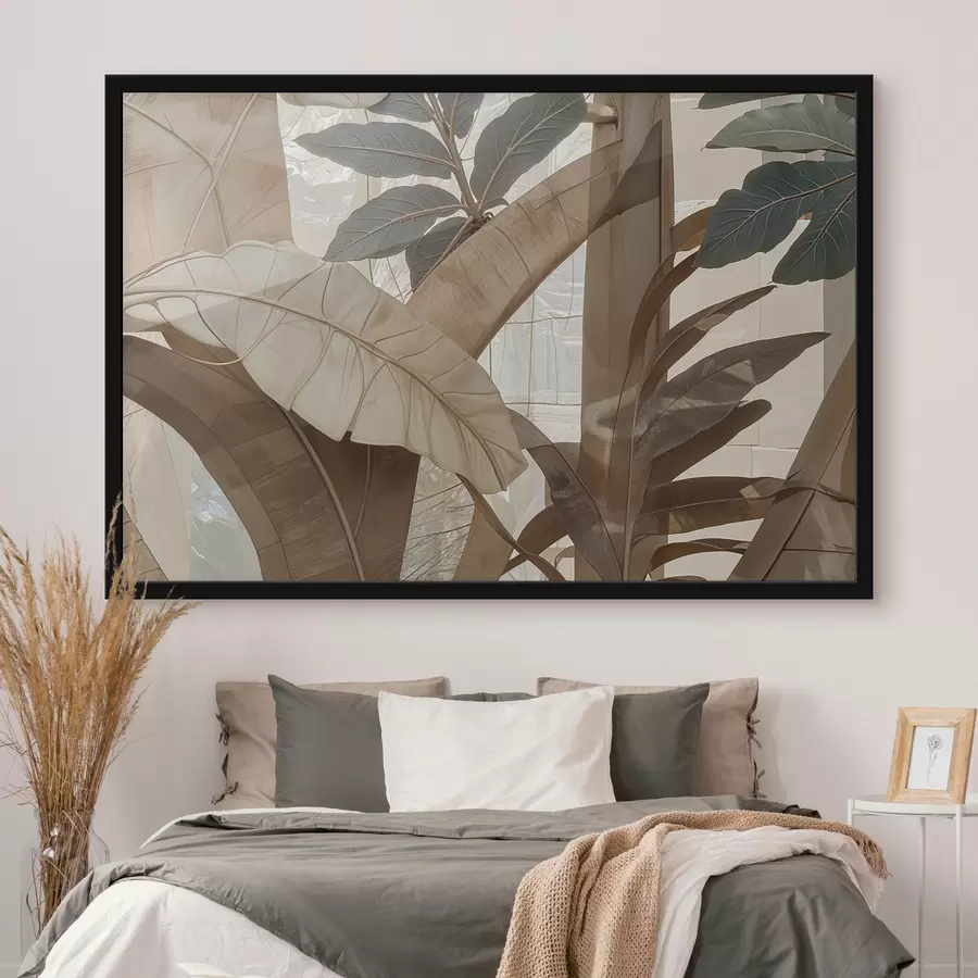 Atogrąžų palmių lapai, gėlių, realizmas, monstera