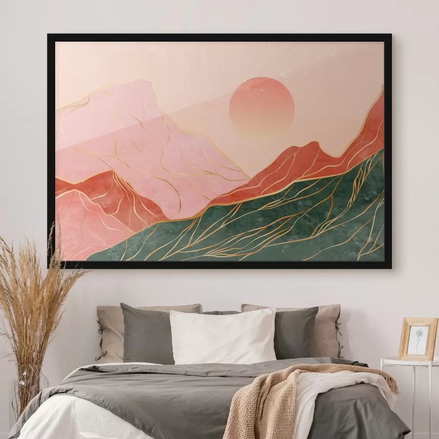 Kaimo kraštovaizdžiai aliejinio stiliaus piešinys, saulėlydis