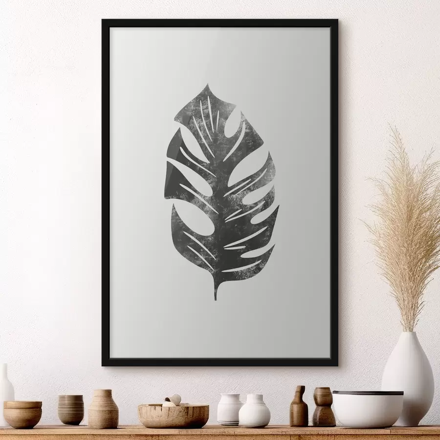 Monstera, lanksti forma, atogrąžų lapai, didelės skylės, minimalizmas, juoda ir pilka spalva