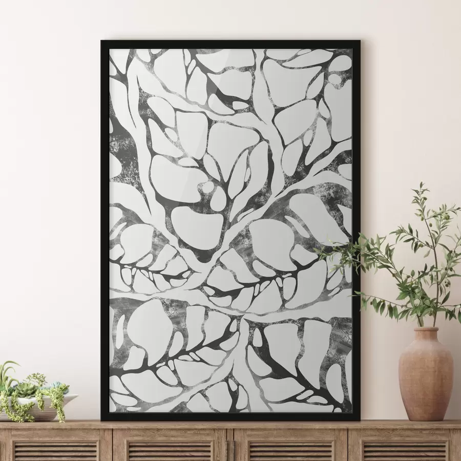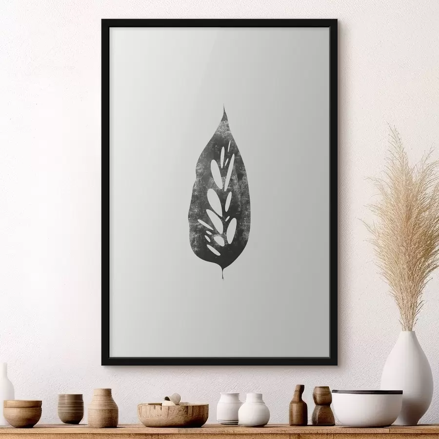 Minimalistinis juodas tropinis lapas su pjūviais ir tekstūra, juoda, pilka spalva