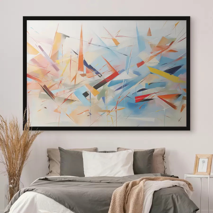 Chaotiška dinamiška geometrinė abstrakcija, mėlyna, raudona, geltona