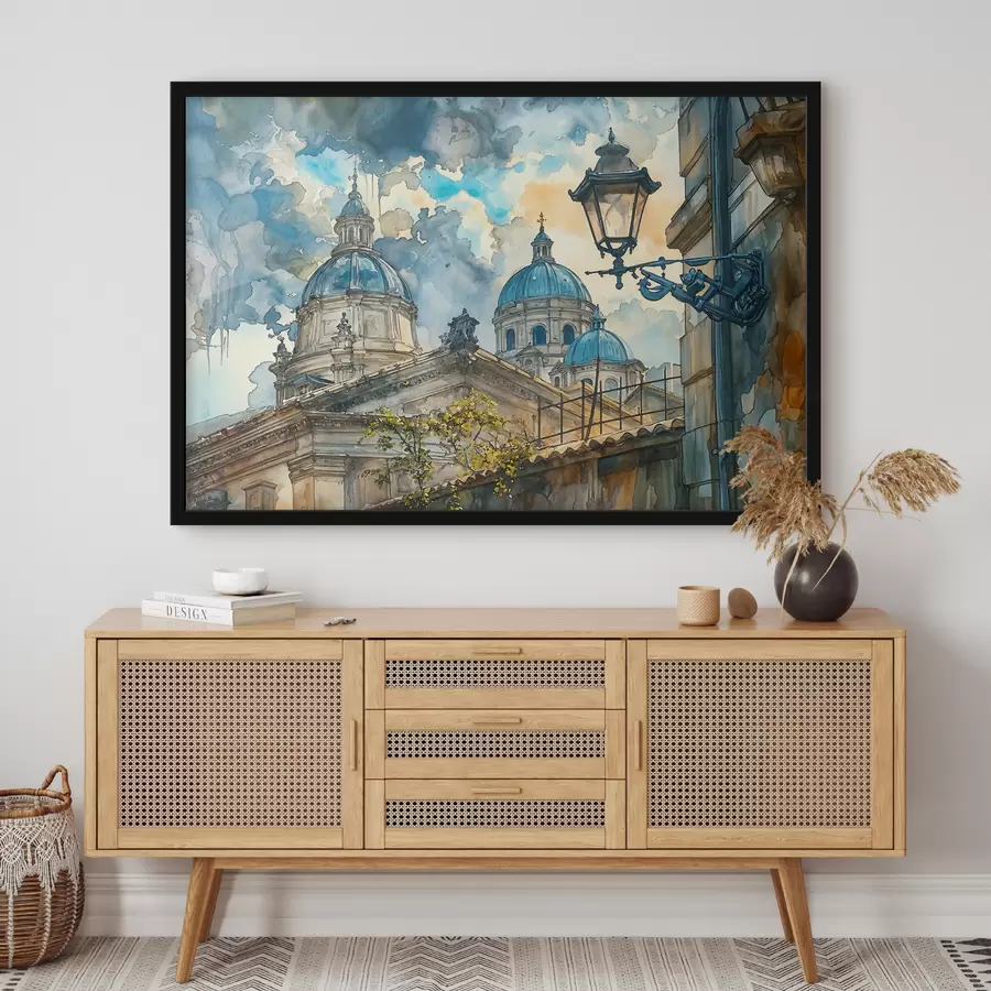 Miesto panoramos pastatų ir dramatiško debesuoto dangaus tapyba akvarele.