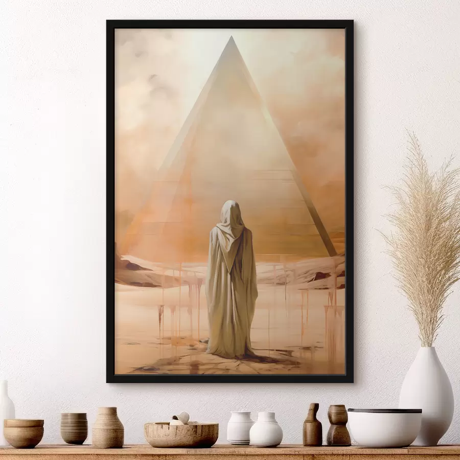 Vyro baltu apsiaustu su gobtuvu siluetas piramidės fone dykumoje