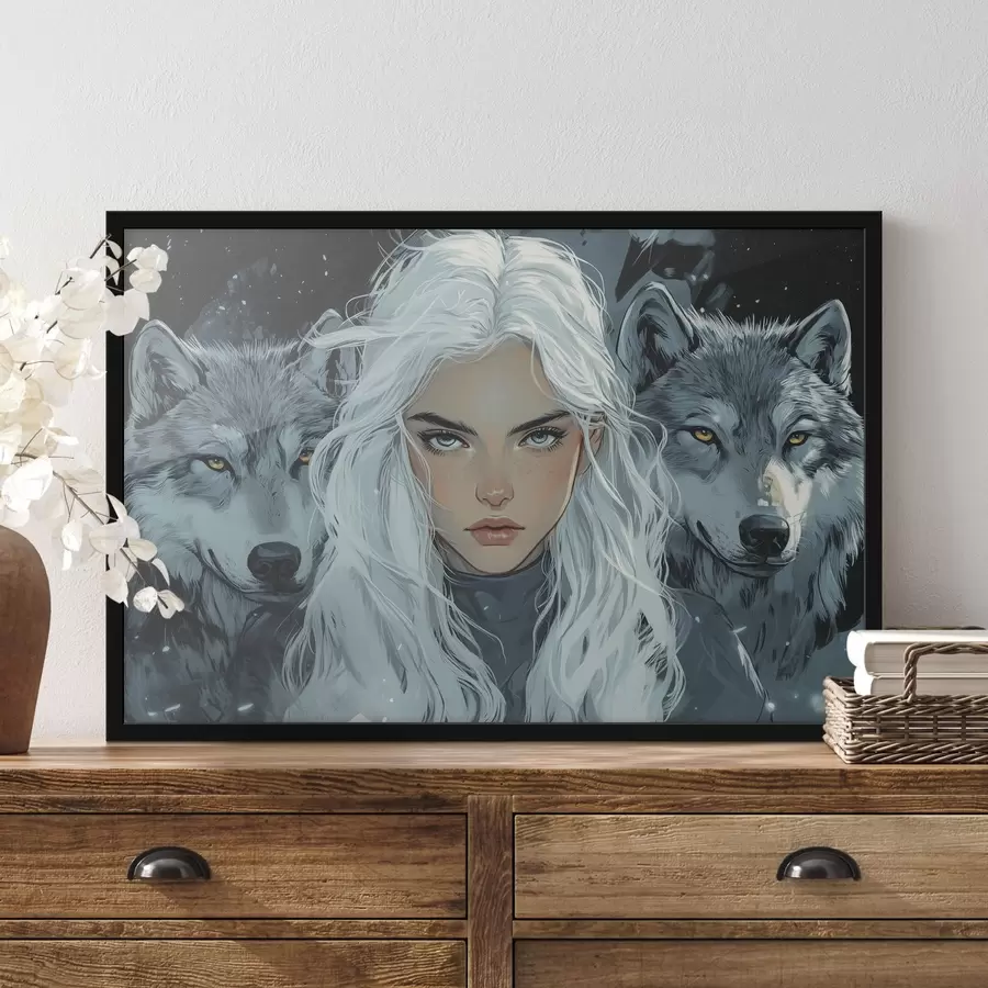 Graži mergaitė su vilkais, anime stilius, pilka spalvų paletė