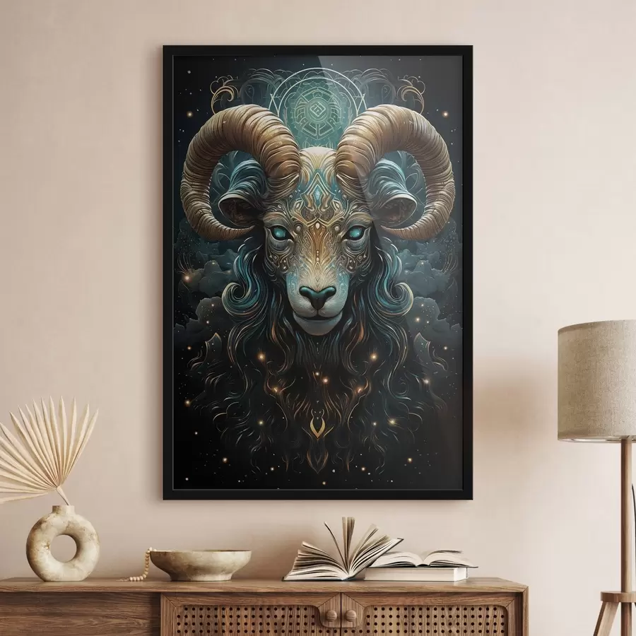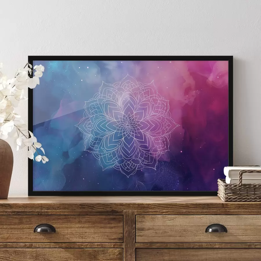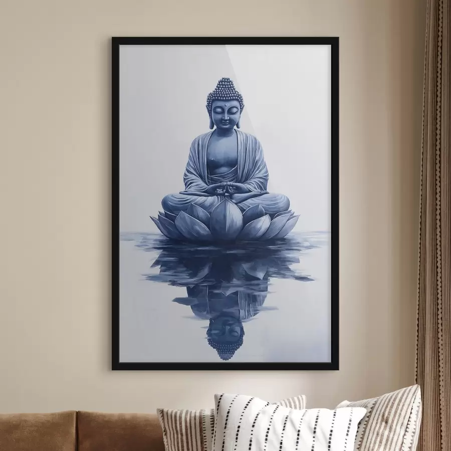 Medituojantis Buda ežere su lotosais, rytietiškas, akrilo stilius