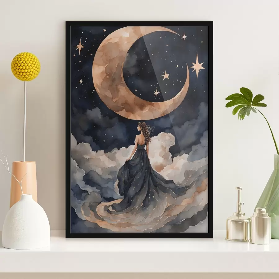 Moteris su lotoso žiedu saulėlydyje, baltas paukštis, piešinys aliejiniais dažais