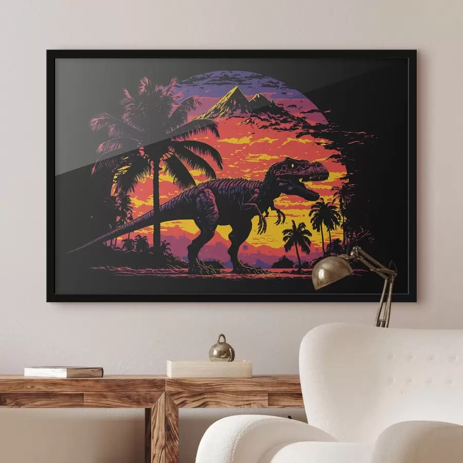 Dramatiškas jūros peizažas su griaudžiančiomis bangomis ir uolomis, ryškiai oranžinės ir geltonos spalvos saulėlydžio dangus su debesimis