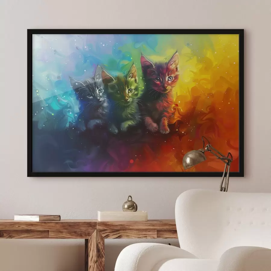 Baltos ir oranžinės spalvos katės portretas iš arti su ryškiais, spalvingais dažų purslais