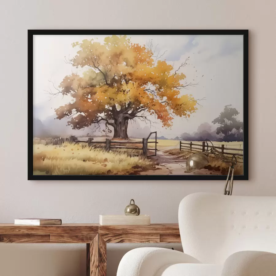 Medis lauke prie tvoros pageltusiais lapais, rudens peizažas