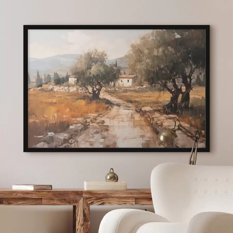 Alyvuogių šakelė su tamsiais vaisiais vasaros peizažo fone