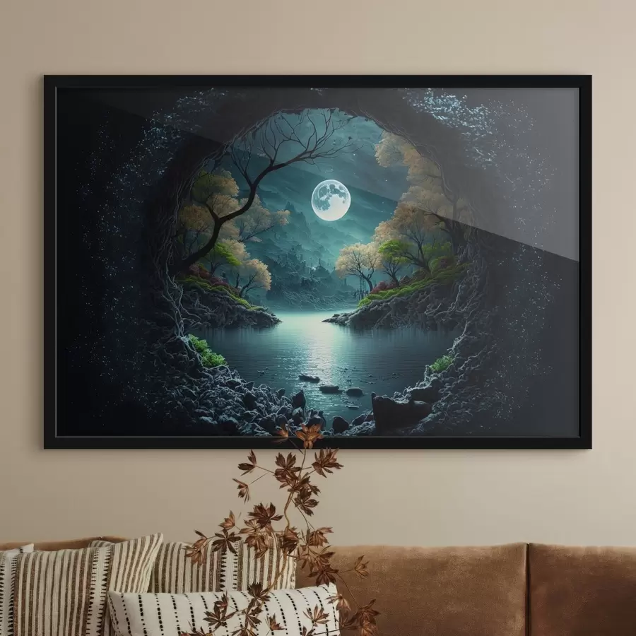 Peizažas tapyba aliejiniais dažais imitacija ramios upės atspindi minkštą šviesą, apsuptas rudens medžių