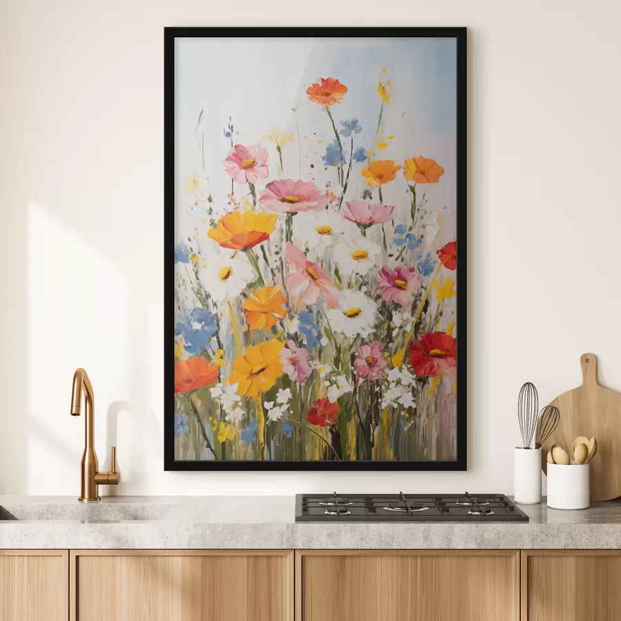Nutapyta simfonija: ryškiai geltoni, oranžiniai, rožiniai ir mėlyni aguonų potėpiai.
