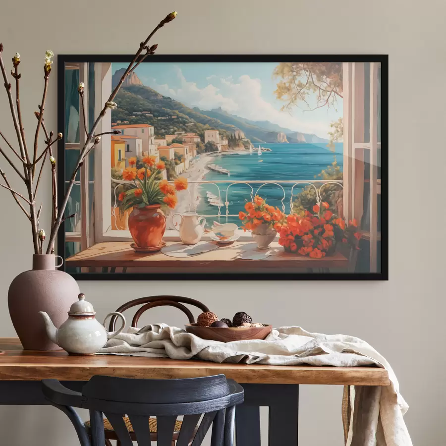 Vaizdas iš balkono į jūros lagūną su kalnais fone, ryškiomis gėlėmis vazonėlyje