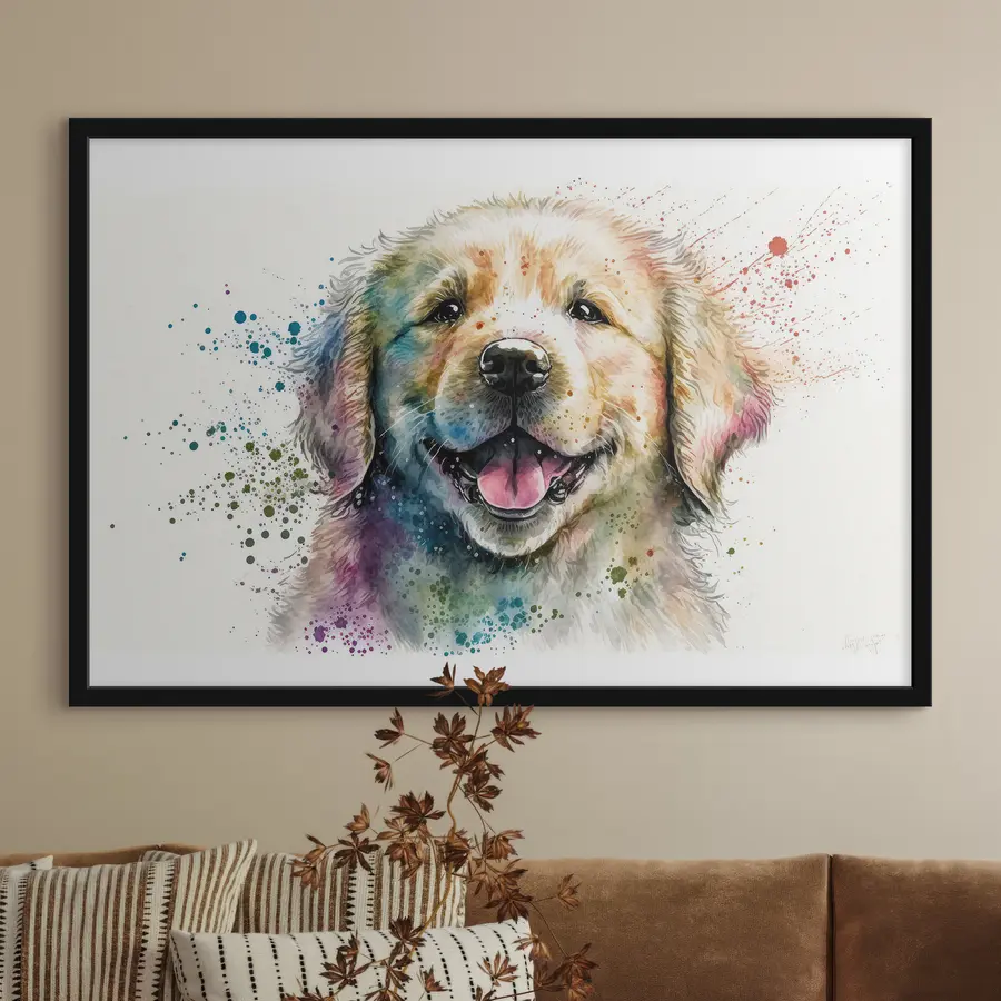 Džiaugsmingas šuniukas su spalvingais purslais
