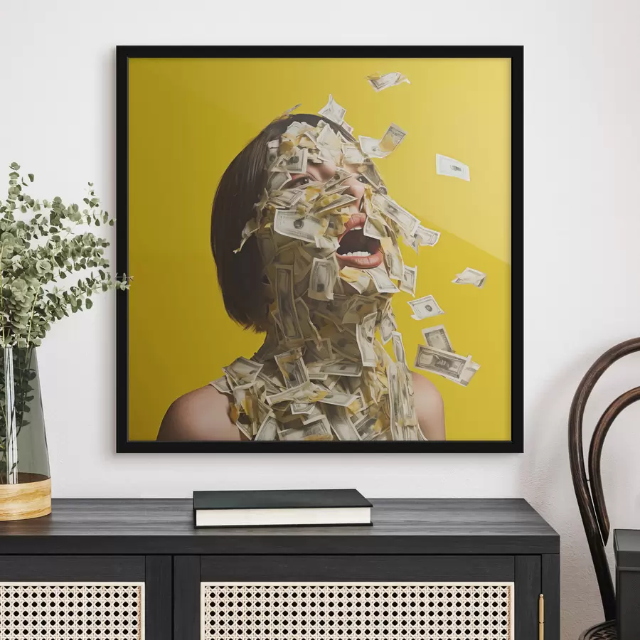 Merginos veidas padengtas popieriniais banknotais, pinigais, geltonas fonas