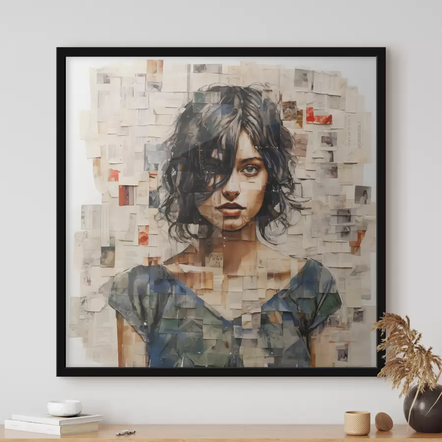 Mergaitės portretas ant seno laikraščio koliažo stiliumi