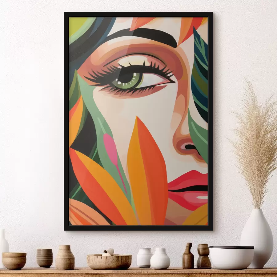 Gražus moters veidas, geometrinė abstrakcija, gėlių