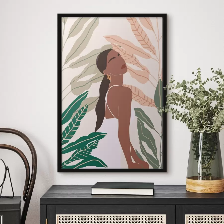 Moters su monsteros lapu portretas su teptuko potėpių imitacija