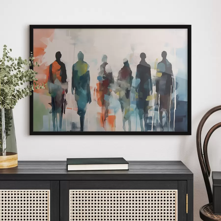 Abstrakčių žmonių grupės siluetai, teptuko potėpių imitacija