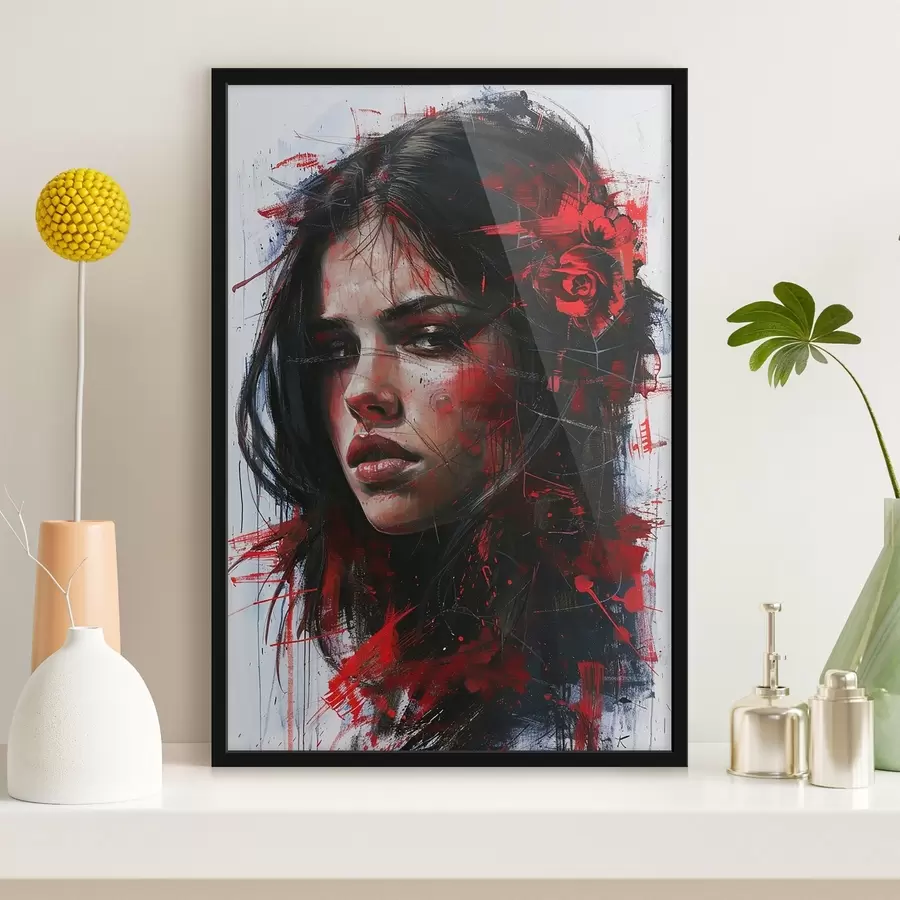 Mergaitė su bijūnais, akrilo stiliaus piešinys, tamsus fonas