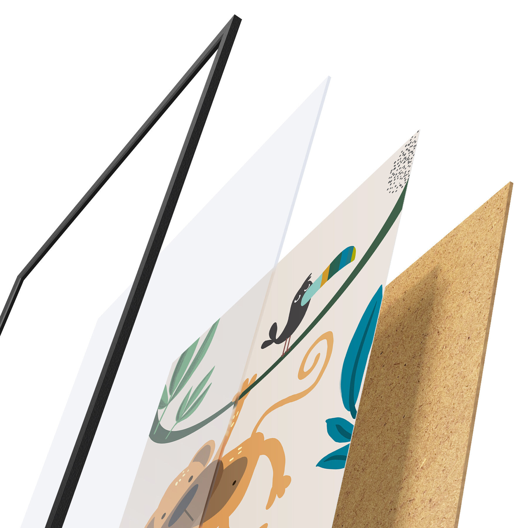 Plakatą sudaro rėmas, pleksiklas, atspausdintas vaizdas ir medžio drožlių plokštės pagrindas. Plakatą galima iš karto pakabinti ant sienos dėl kitoje pusėje esančių laikiklių.