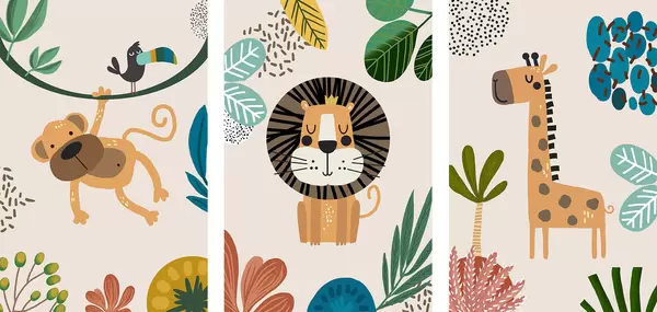 Plakatas Gyvūnai džiunglėse safari, boho stiliaus: beždžionė, liūtas, žirafa Ne d00332