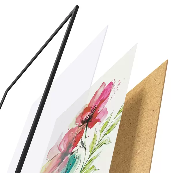Plakatą sudaro rėmas, pleksiklas, atspausdintas vaizdas ir medžio drožlių plokštės pagrindas. Plakatą galima iš karto pakabinti ant sienos dėl kitoje pusėje esančių laikiklių.