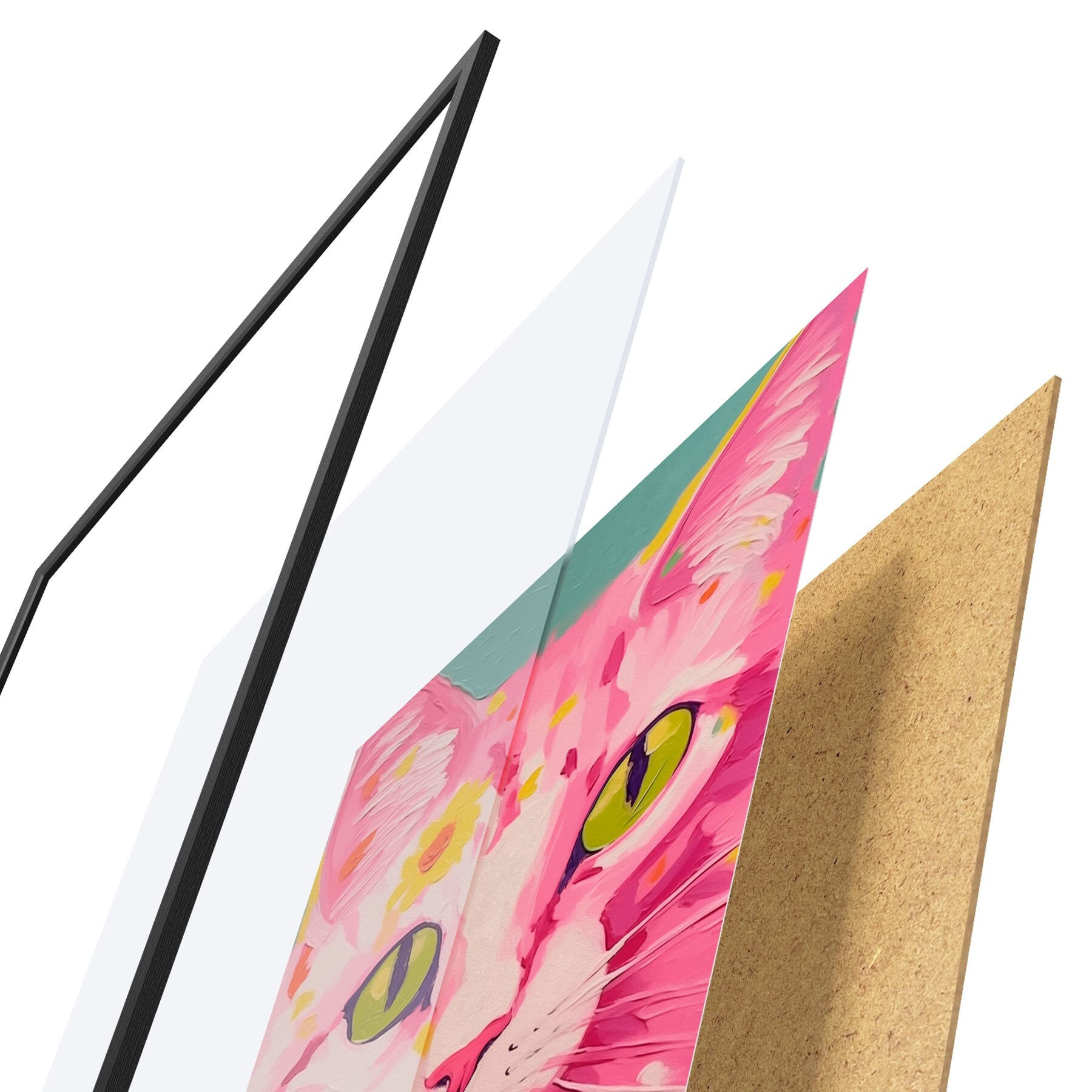 Plakatą sudaro rėmas, pleksiklas, atspausdintas vaizdas ir medžio drožlių plokštės pagrindas. Plakatą galima iš karto pakabinti ant sienos dėl kitoje pusėje esančių laikiklių.