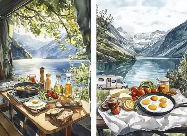 Plakatas Stovyklavimas, estetiniai pusryčiai prie ežero, akvarelės stilius Ne d00405