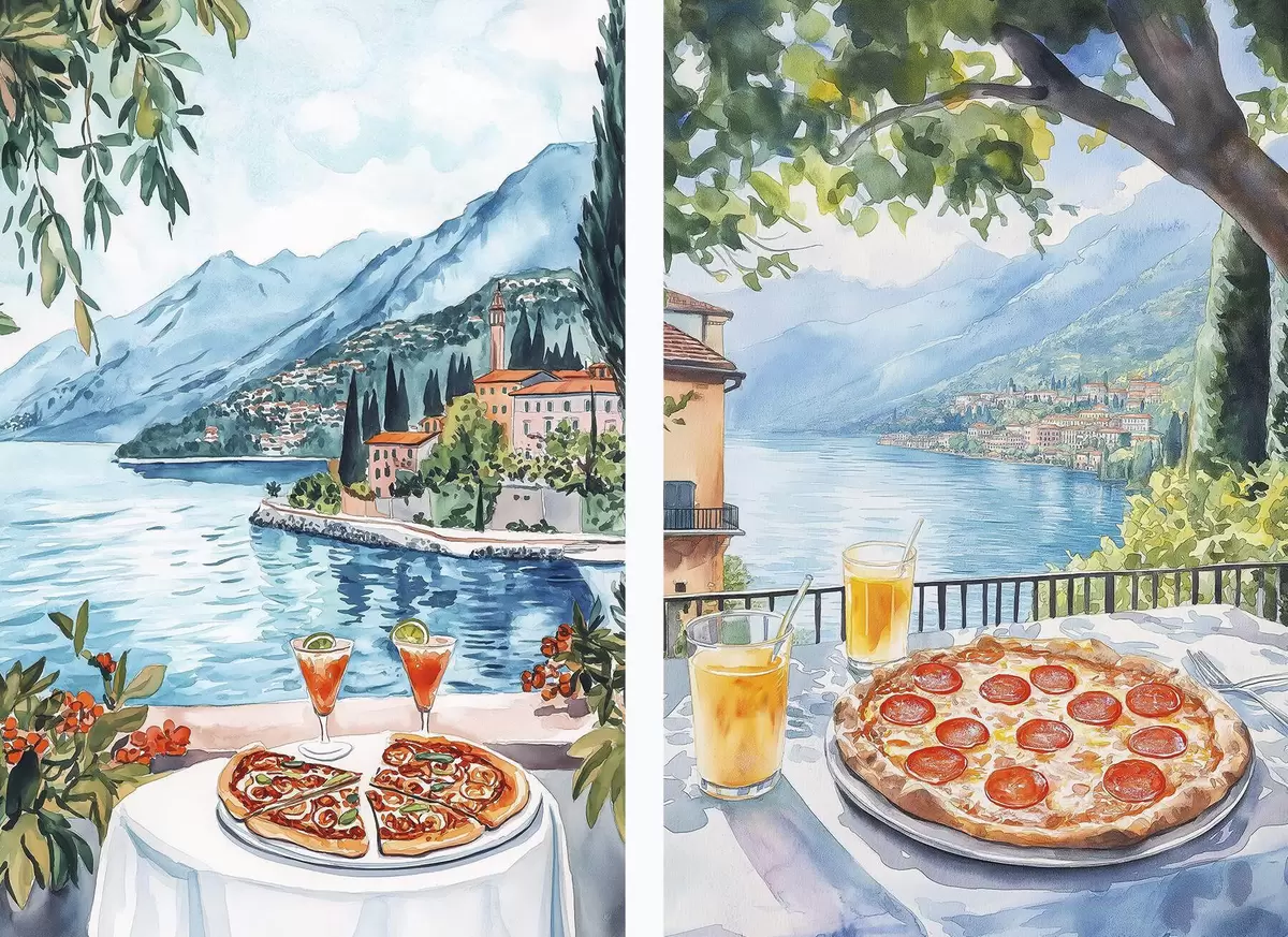 Plakatas Komo ežeras, vėlyvieji pusryčiai Italijoje, akvarelės stilius, pica margarita, vasaros gamta Ne d00406