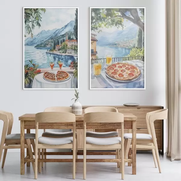 Plakatas Komo ežeras, vėlyvieji pusryčiai Italijoje, akvarelės stilius, pica margarita, vasaros gamta d00406