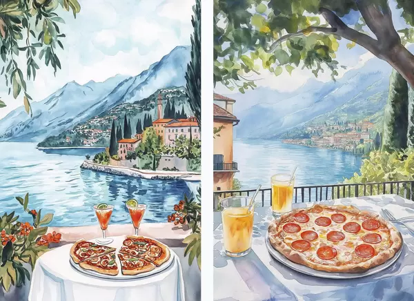 Plakatas Komo ežeras, vėlyvieji pusryčiai Italijoje, akvarelės stilius, pica margarita, vasaros gamta Ne d00406