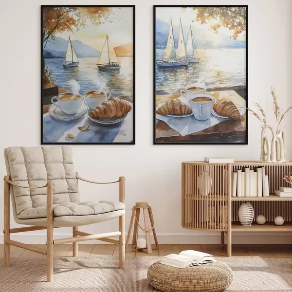Plakatas Saulėlydis ant ežero su kavos puodeliu, burlaiviai, gamta, kelionės d00407