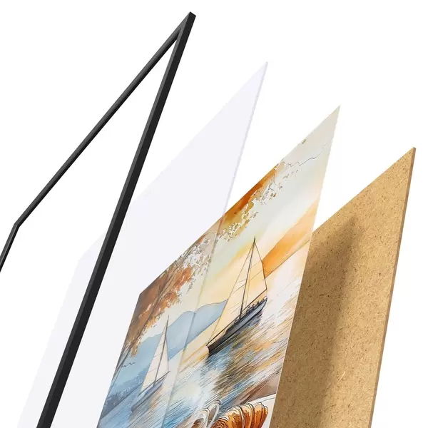 Plakatą sudaro rėmas, pleksiklas, atspausdintas vaizdas ir medžio drožlių plokštės pagrindas. Plakatą galima iš karto pakabinti ant sienos dėl kitoje pusėje esančių laikiklių.