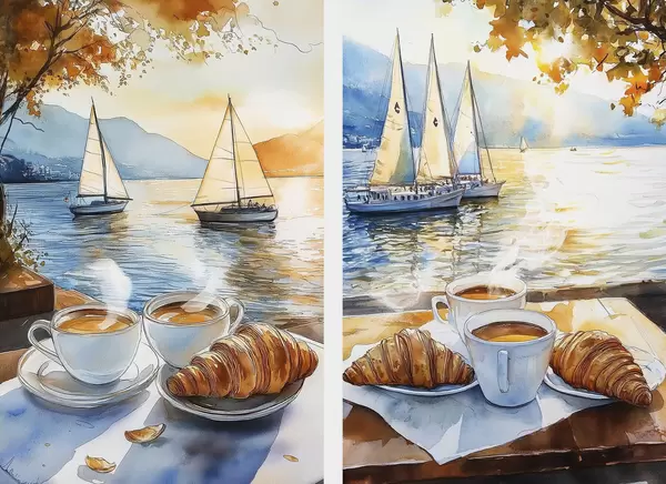 Plakatas Saulėlydis ant ežero su kavos puodeliu, burlaiviai, gamta, kelionės d00407