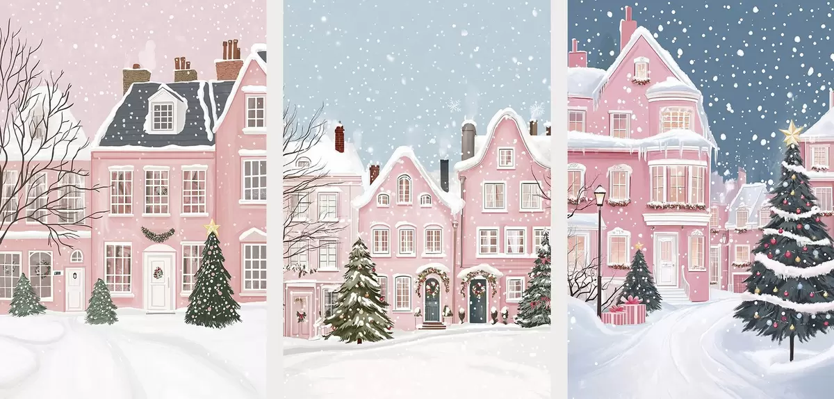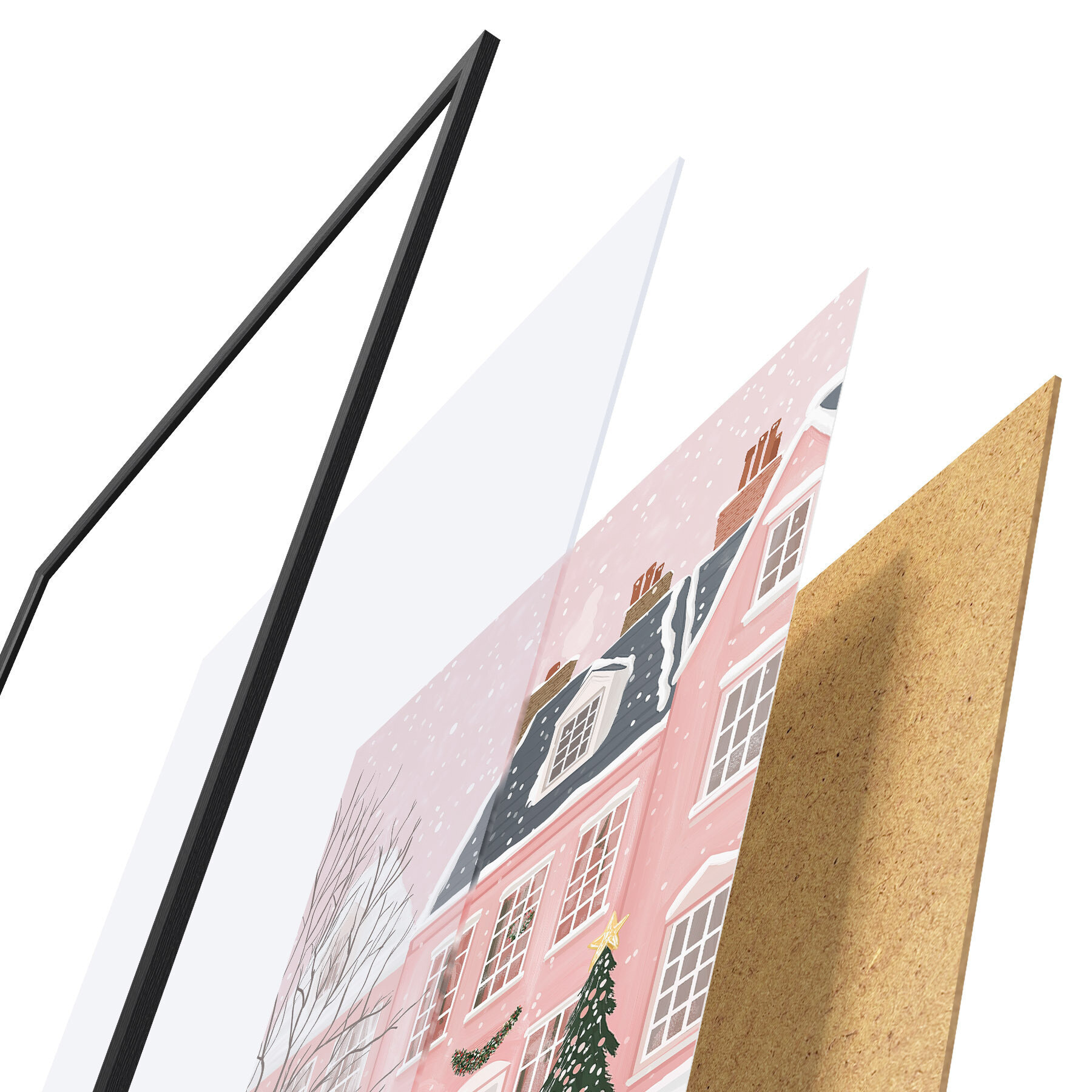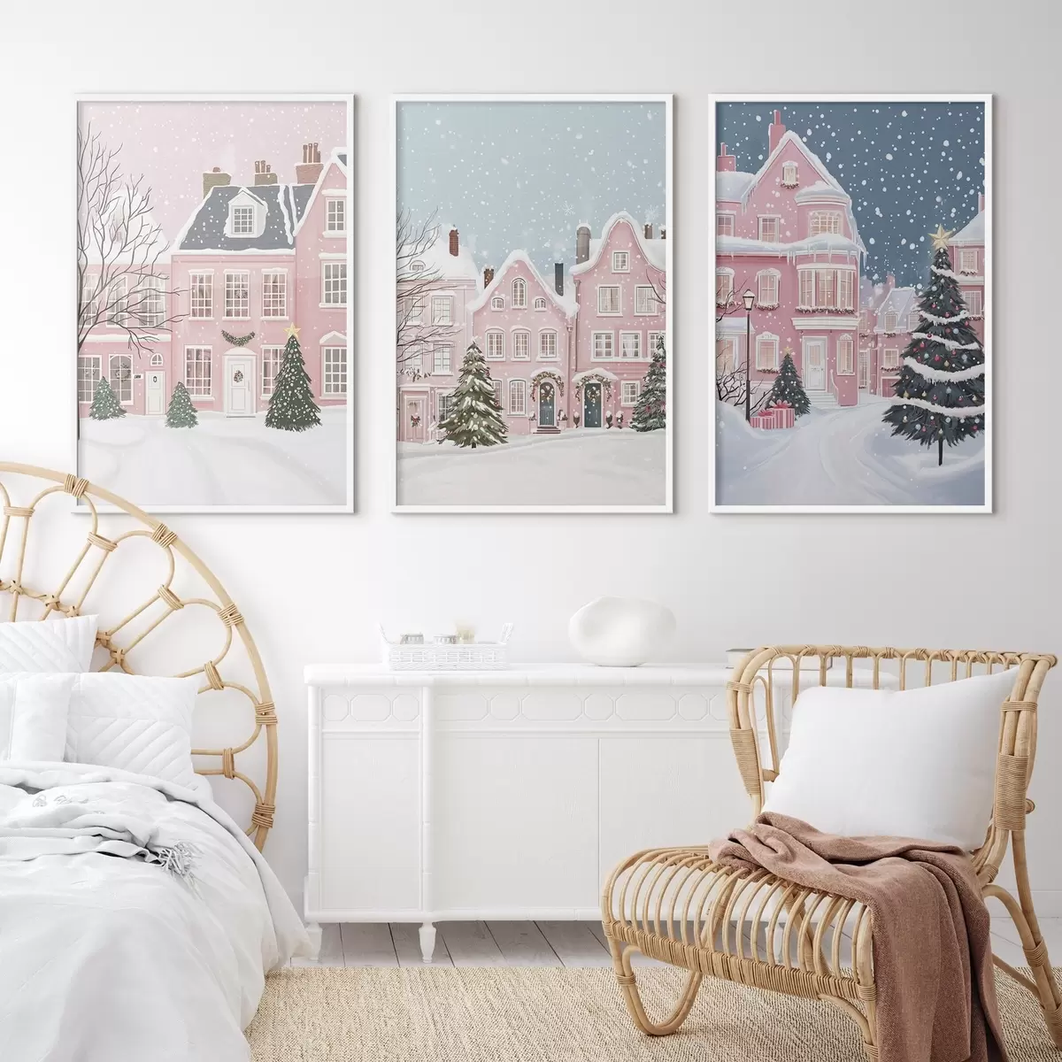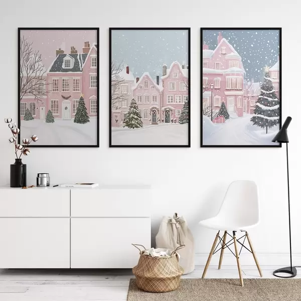 Plakatas Gražus žiemos miestas su rožiniais namais, pušimis ir snaigėmis d00410