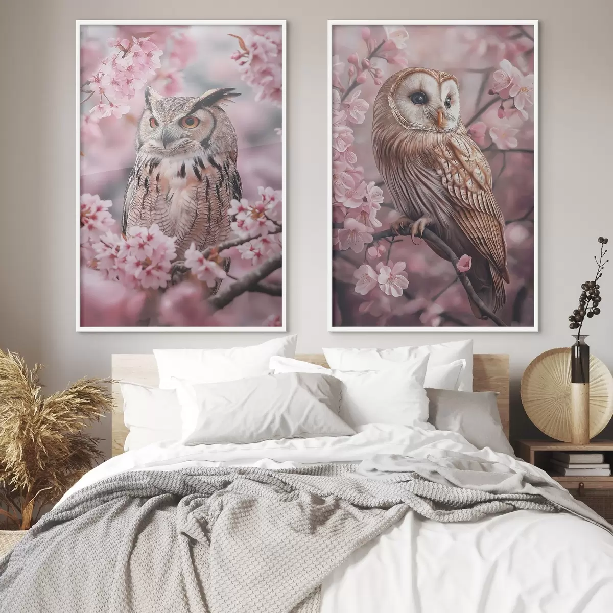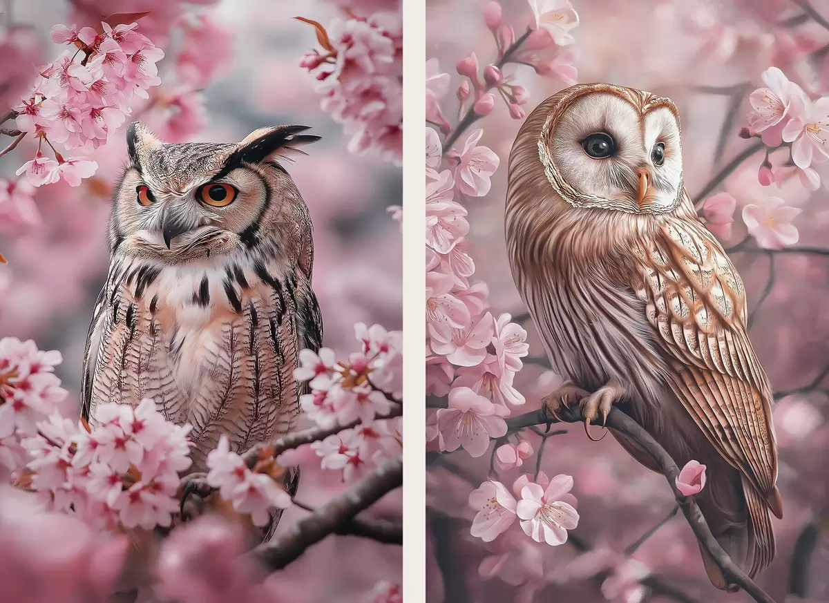 Plakatas Pelėdos ant vyšnios medžio, rožinės gėlės, realizmas, gamta Ne d00411