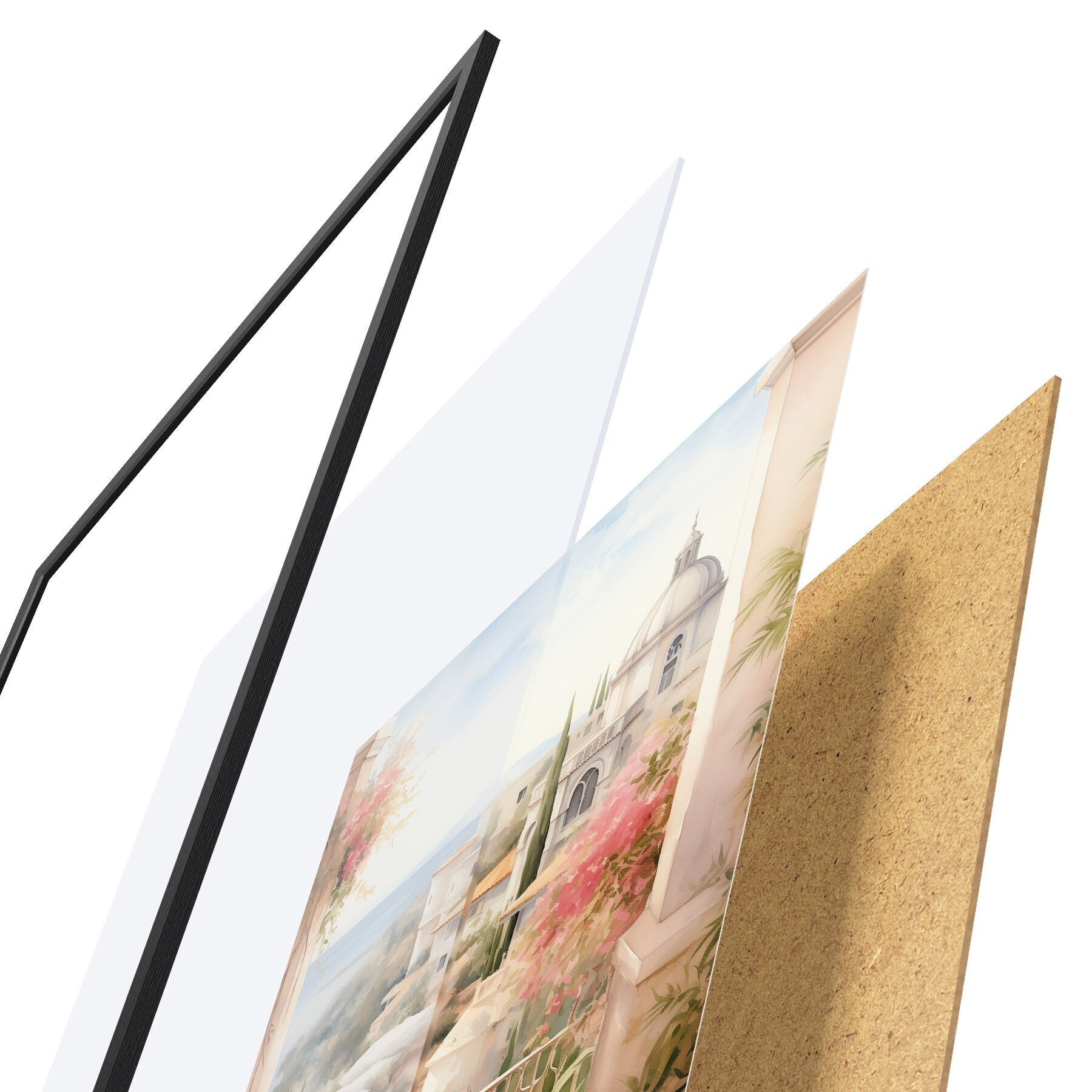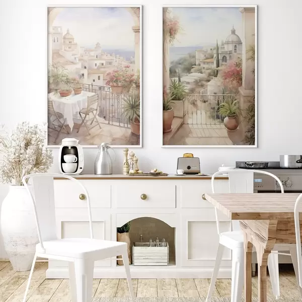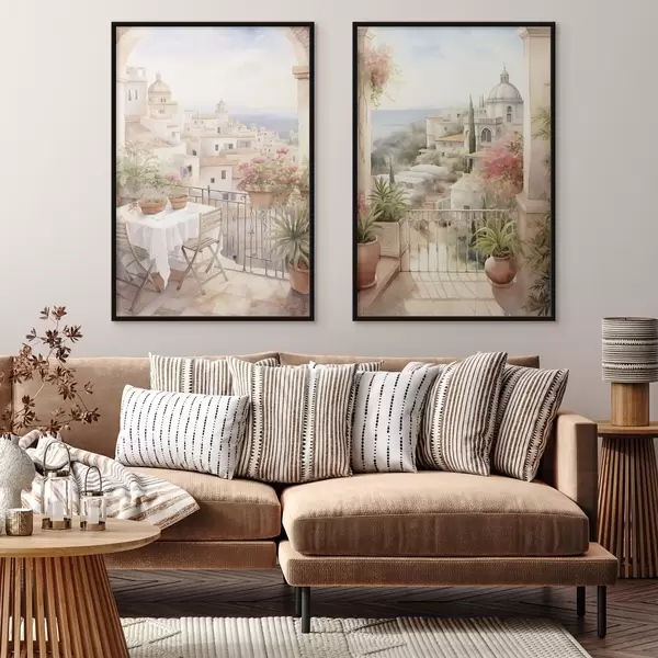Plakatas Saulėlydis balkone, architektūra, žydinčios gėlės, akvarelės stilius, Viduržemio jūros regionas d00420